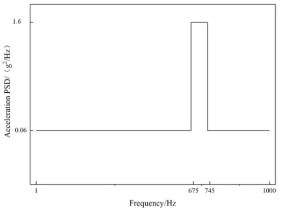 Based on the modal similarity relationship between the scaled and original model, the random vibration power spectral load of the exhaust duct is adjusted, as shown in Figure 21. The frequency range and magnitude of the random vibration power spectrum are specified as follows: the frequency range of the broadband background is 1–1000 Hz, with a magnitude of 0.06 g2/Hz; and the frequency of the narrowband peak is 710 Hz, with a bandwidth of 675–745 Hz, and a magnitude of 1.6 g2/Hz.