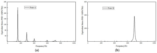 The same location exhibiting maximum equivalent stress, as identified in Section 3.2, is designated as the monitoring point. For the analysis of vibration response under X-axial loading, monitoring point A (located at the position of node 20,651) is selected; conversely, for Y-axial loading, monitoring point B (located at node 1178) is chosen. As illustrated in Figure 22, the stress response trends of the exhaust duct remain consistent, although the response amplitudes vary. In practical engineering applications, particular emphasis is placed on the magnitude of peak responses and their corresponding frequencies in the frequency response curve, thereby necessitating the use of the segmental similarity method to predict the original model’s response based on the response quantities of the scaled model.