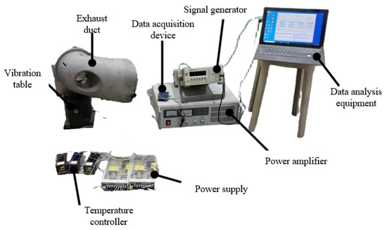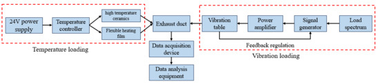 In the context of vibration loading, the load spectrum is converted into a voltage signal input for the signal generator, which subsequently produces the corresponding voltage signal. After amplification by the power amplifier, this signal drives the vibration table, with real-time feedback provided by the acceleration sensor to adjust the voltage signal; simultaneously, the acceleration signal is recorded and saved. Regarding temperature loading, the temperature controller is powered by a 24 V power supply and regulates the exhaust duct’s temperature using 50 mm × 50 mm high-temperature ceramics, 15 mm × 15 mm high-temperature ceramics, and flexible heating film. Temperature is continuously monitored, and feedback is provided in real time via a thermocouple, thereby establishing a closed-loop control system. The data acquisition system collects data through strain gauges and transmits it to the data analysis equipment for post-processing. The data analysis equipment then processes the collected strain data to generate strain spectra, which are subsequently converted into stress spectra.