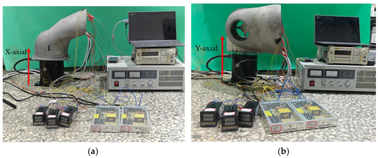 On-site diagram of the thermal vibration experiment. (a) X-axial loading; and (b) Y-axial loading.
