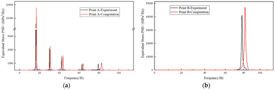 By converting the time-domain signals of the test results into frequency-domain signals, the stress response spectrum of the experiment specimen was obtained. During the experiment, three repeat tests were conducted, demonstrating relatively good consistency in the results. Ultimately, the final experimental result was derived by calculating the average of these three test results. Subsequently, based on the frequency and stress similarity ratios from Section 3.3.1, the stress response spectrum of the measurement points on the specimen after similarity transformation was derived and compared with the finite element analysis results. Table 3 presents a comparison of the predicted frequencies from the exhaust duct experimental model with those of the original model. It can be observed that the predicted frequencies, after transformation using the similarity ratio, have a relative error of no more than 5% when compared to the computed frequencies of the original model, indicating a good agreement between the analysis results and the experimental results.