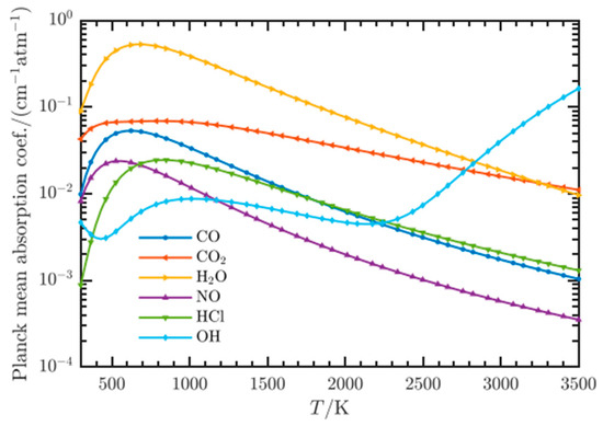 After line-by-line integration and spectral integration of the full-spectrum blackbody radiation function, the gas absorption coefficients at different compositions and temperatures were obtained. The calculation results are shown in Figure 1. The radiation characteristics of CO2 and H2O gas components are strong, while OH has a higher absorption coefficient in the high-temperature band.