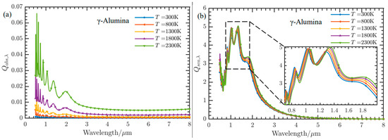 Spectral radiation characteristics of 1 µm γ-phase solid alumina particles at different temperatures. (a) Spectral absorption coefficient. (b) Spectral scattering coefficient.
