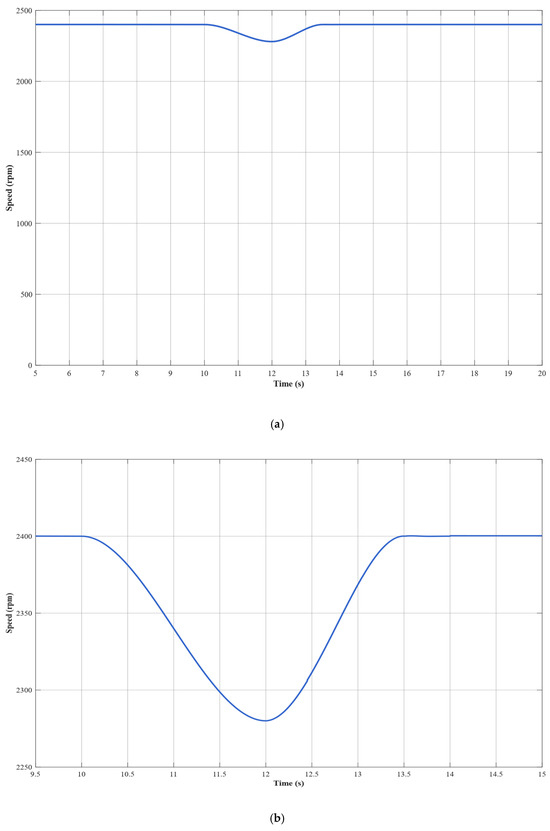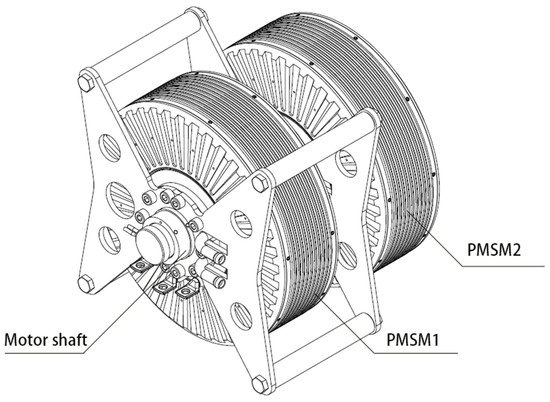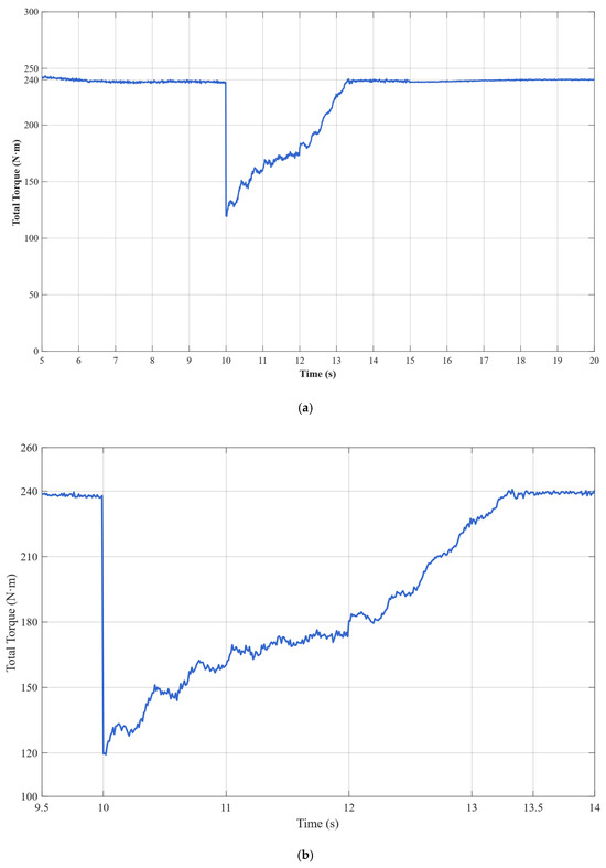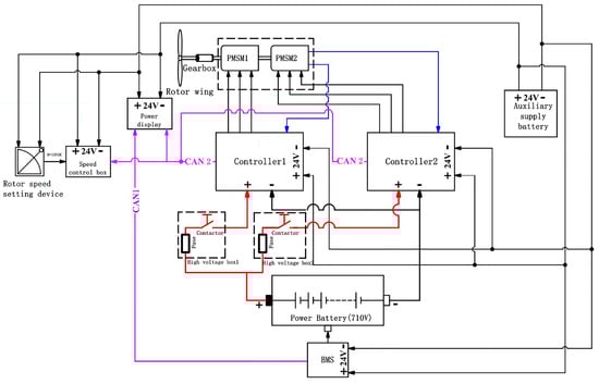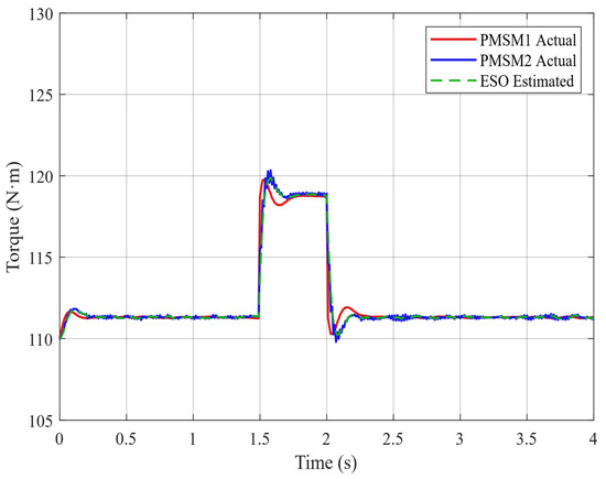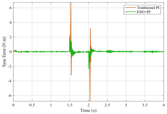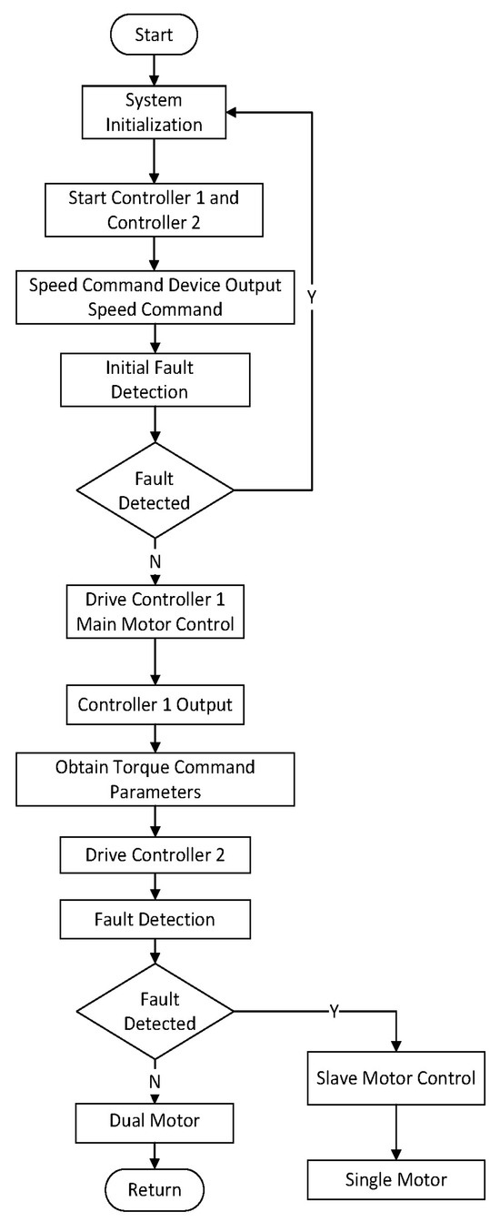 To improve the reliability and fault tolerance of electric helicopter propulsion systems, this paper presents a master–slave fault-tolerant control method based on an extended state observer (ESO) for dual-redundant electric propulsion systems that addresses dynamic coupling disturbances. First, the control architecture puts the master motor in speed loop mode and puts the slave motor in torque loop mode with an ESO to estimate disturbances and compensate for mechanical coupling torque through feedforward control based on Lyapunov stability theory. Second, a least squares parameter identification method establishes a current-torque mapping model to ensure consistent dual-motor output. Then, fault-tolerant switching is implemented, transitioning from normal torque mode coordination to independent speed mode with adaptive PI adjustment during faults. Experimental validation shows that the total torque stabilizes at 240 N·m, and the synchronization error remains within ±0.5 N·m during normal operation. Under single-motor fault scenarios, the ESO detects disturbances within 15 ms with >95% accuracy. The system speed decreases to a minimum of 2280 rpm (5% deviation) and recovers within 3.5 s. Compared to traditional PI control, this method improves torque synchronization by 65.4%, speed stability by 62.6%, and dynamic response by 51.2%. Finally, the results validate that the method effectively suppresses coupling interference and meets aviation safety standards, providing reliable, fault-tolerant solutions for electric helicopter propulsion. Full article