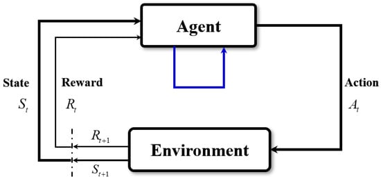 As illustrated in Figure 1, DRL is governed by Markov decision process (MDP) in the training process, which provides a basic mathematical framework for solving the decision-making problems, with uncertainty and long-term cumulative rewards []. MDP usually consists of five elements (S, A, R, P, γ), in which S is all the possible states or actual states of agent in the environment; A is the actions of agent; R is the reward obtained by agent after one action a ∈ A in one state s ∈ S; P is the state transition probability function, which determines the next S’ given state S = s and action A = a; and γ is the discount rate, which determines the importance of a future reward.