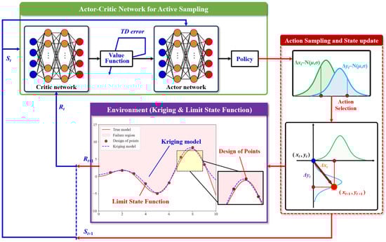In this study, the AC-Kriging method is proposed for efficient structural reliability analysis, integrating the Actor–Critic reinforcement learning framework with the Kriging model to optimize the selection of experimental sampling points, aiming to accurately approximate the limit state surface while reducing computational cost. As illustrated in Figure 2, the AC-Kriging method establishes correspondences between reliability analysis and the reinforcement learning paradigm: the sampling space represents the environment state, the deep neural network serves as the agent, and the selection of experimental points corresponds to actions.