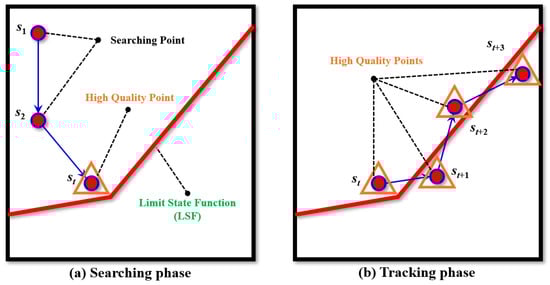 As shown in Figure 4, the AC-Kriging sampling process consists of two phases: in the searching phase (a), the agent starts from random positions to locate the LSF and identify high quality (HQ) points; in the tracking phase (b), the agent initializes from the discovered HQ point to systematically extract more sampling points along the LSF, achieving efficient boundary-following for structural reliability analysis.