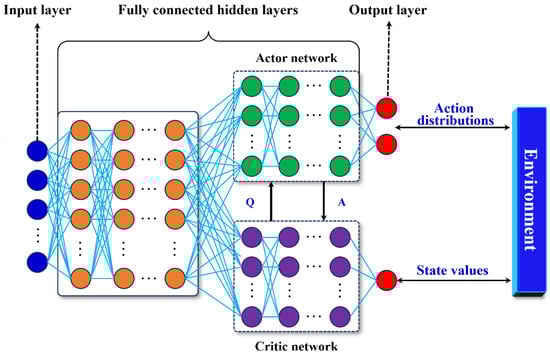 As shown in Figure 5, the Actor–Critic network is a reinforcement learning architecture that combines policy gradient and value function estimation, in which (1) the Actor network uses neural net π(a|s;θ) to approximate π(a|s), where θ is trainable parameters of the neural net, aiming to learn an optimal policy that maximizes the expected cumulative reward; (2) the Critic network uses neural net q(s,a,ω) to approximate Qπ(s,a), where ω is a trainable parameter of the neural net, aiming to compare the expected return from the selected actions with the actual rewards received and provide feedback to the Actor for policy improvement.