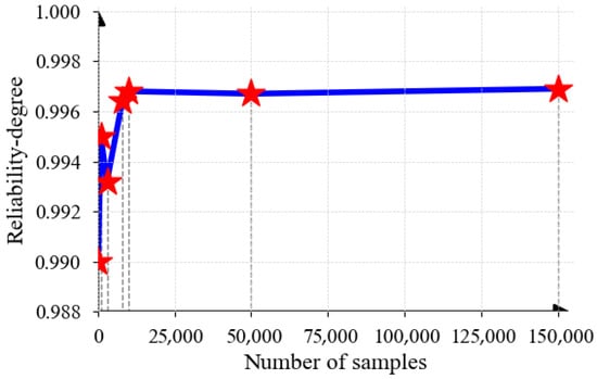 Reliability convergence analysis as a function of a sample number. (Note: The red star is the value of reliability degree.)