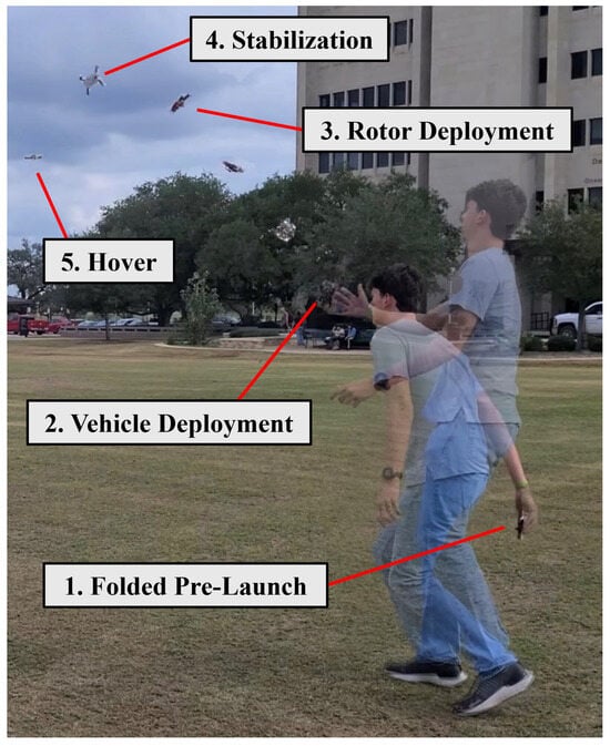 The small size and high maneuverability of hover-capable rotary-wing MAVs make them a promising solution for ISR in crowded urban environments. For example, researchers at ETH Zürich have developed navigation software for MAVs to be extremely effective in search and rescue missions, specifically allowing them to fly through tight spaces caused by earthquake damage [5]. Although there have been many studies to understand MAV flight dynamics and control, navigation, aerodynamics, aeroelasticity, etc., an area that has lacked attention is the robust deployability of MAVs [6,7,8,9,10,11,12,13]. There could be emergency scenarios where the MAV has to be deployed rapidly in the field and therefore taking off from a stationary surface may not be feasible. For example, there could be a need for rapid ISR on the battlefield, and the warfighter may have to take out a folded MAV and simply throw it up in the air to deploy it. This means that the MAV has to first self-deploy (or unfold) in the air, then stabilize itself from a tumbling state to a trimmed state, and further perform the mission. Such scenarios form the motivation for the present work.