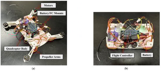 Currently, an MAV with its maximum dimension, length, of approximately 15 cm when unfolded and approximately 11 cm when folded is designed and built (shown below in Figure 2). The width of the vehicle when unfolded is approximately 12 cm and approximately 6 cm when folded. The main body of the MAV is 3D-printed using PLA plastic and provides anchor points for the rotatable propeller arms, servo motor, and flight controller. The propeller arms and flight controller mounts are also 3D-printed with PLA plastic. Each propeller arm can independently rotate about a steel pin mounted to the main body and is restricted from rotating using a torsional spring. The moment of the spring maintains the propeller arm in the unfolded position, as seen in Figure 2a. The flight controller mount serves a dual purpose because it also restrains the 2-cell (7.4 V) Lithium Polymer (LiPo) battery beneath the flight controller. The propeller arms can be folded individually and once folded, the motors and propellers fit within the rectangular profile of the quadcopter, as shown in Figure 2b. The weight breakdown of the vehicle is shown in Table 1. The center of mass of the vehicle is almost at the geometric center, however, shifted longitudinally towards the servo motor (rear of the quadcopter) by just 4.5 mm or roughly 3% of the length and with negligible variations from the center in the lateral direction. The battery accounts for 16.25% of the vehicle’s mass, which restricts the endurance. Specifically, since the battery has a capacity of 350 mAh and the quadcopter draws approximately 1.3 A in hover, the endurance is around 13 min when the LiPo battery is discharged by 80% (standard discharge amount for battery health). As stated in the Introduction, this vehicle also struggles with endurance like other MAVs; however, the vehicle consumes less power during take-off due to hand launch, and a higher-capacity battery can extend endurance.