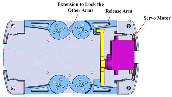 To keep the quadcopter in its folded position, a locking mechanism was designed that works by having an aluminum release arm attached to a servo motor (see Figure 3). The release arm locks the two propeller arms that are closer to the servo motor. The other two propeller arms are folded and held back within the rectangular profile by the two locked propeller arms. The folding of the propeller arm would wind the respective torsional spring mentioned before. When the servo motor is turned clockwise, the release arm no longer locks the propeller arms in the folded position, allowing them to unfold using the restoring torque of the wound torsional spring. Once the arms are fully unfolded, the propellers could spin up and stabilize the quadcopter. Betaflight software™, version 4.3.1, is used to program the flight controller in such a way that the two positions (locked and unlocked) of the servo motor can be controlled by flipping a switch on the RC transmitter. Furthermore, once the arms are unfolded, the controller automatically starts the motors and begins to stabilize the quadcopter from any initial orientation, velocity, and acceleration.