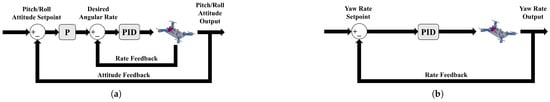Controller feedback loops. (a) Pitch and roll feedback loop, (b) yaw feedback loop.