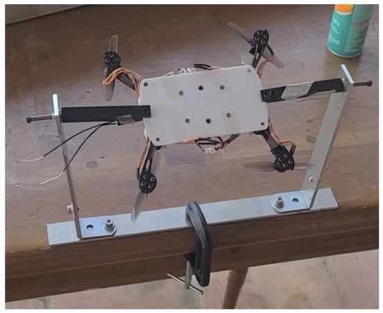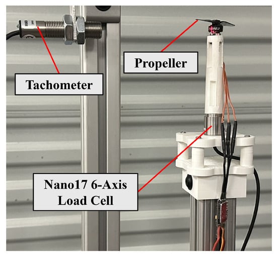 Propeller thrust and torque were measured at different rotational speeds to provide the input data for the flight dynamics model. The motor utilized on the quadcopter is the Diatone Industries Mamba 1103, 8500 Kv 5 g brushless motor, and it is combined with a durable HQ 65 mm two-bladed propeller. A Nano17 6-axis load cell is utilized to measure propeller thrust and torque using a hover-stand instrumented with a laser tachometer to measure the rotational speed (shown in Figure 9). The 3D-printed post between Nano17 and the motor is three rotor radii in height to ensure that the ground effect does not influence the measurements. Tests were conducted to map the propeller thrust and torque as a function of the RPM in hover.