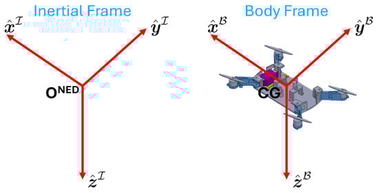 A flat and non-rotating Earth is considered as the inertial frame of reference, denoted , with its origin located at the home position. Using the North-East-Down (NED) coordinate system, a standard choice in the aeronautical literature [20,21], the inertial frame aligns with (x-axis) pointing northward, (y-axis) eastward, and (z-axis) downward, perpendicular to the X-Y plane, as shown in Figure 10. The body frame, denoted as , represents a coordinate system rigidly attached to the aircraft. In this frame, the unit vector (x-axis) is directed towards the nose of the aircraft, the unit vector (y-axis) is positioned to the right of the x-axis from the pilot’s perspective, and the unit vector (z-axis) points downwards through the bottom of the aircraft, perpendicular to the X-Y plane. The origin of this coordinate system is located at the center of gravity (CG) of the vehicle. Note that when the orientation of the aircraft changes, the body frame rotates correspondingly at the same angular velocity.