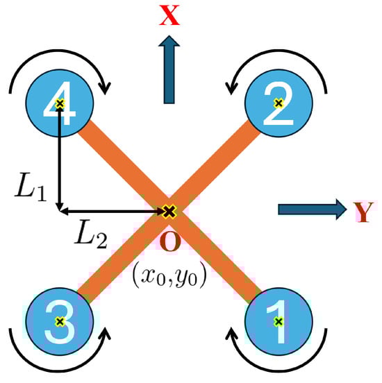 The quadcopter MAV is assumed to have a configuration in the body frame as shown in Figure 11. The quadcopter MAV model has a symmetric structure with respect to the geometric center O of the vehicle. Each rotor is located at and distances along the x-axis and y-axis, respectively, from the center. It is important to note that the geometric center O is not the origin of the body frame; instead, the CG of the aircraft is designated as the origin of the body frame. The geometric center is located at the coordinates (, ) relative to the CG of the aircraft. Rotors 2 and 4 produce a negative pitching moment, while rotors 1 and 3 produce a positive pitching moment. Similarly, rotors 1 and 2 generate a negative rolling moment, whereas rotors 3 and 4 produce a positive rolling moment. Finally, rotors 1 and 4 create an anti-clockwise (-ve) yawing moment while rotors 2 and 3 create a clockwise (+ve) yawing moment.