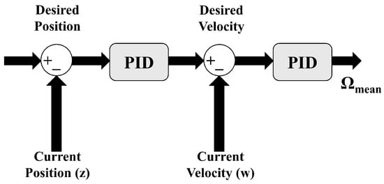 The motion along the vertical z-axis is controlled using two cascaded PID loops, as depicted in Figure 12. The first PID loop controls the position, while the second PID loop regulates the velocity. The desired altitude of the vehicle is obtained from the desired trajectory. The position error along the z-axis is the input to the first PID loop, which regulates the desired velocity along the z-axis. The output of this PID loop is then used as input for the second PID loop, which calculates the velocity error along the z-axis. The final output of the controller is the desired mean RPM () for each motor. Adjusting the RPMs of each motor by an equal amount of (), the thrust on each rotor is affected equally, allowing the aircraft to move vertically up or down. This approach ensures that changing the RPMs does not affect any other control parameters, allowing smooth and stable vertical motion control.
