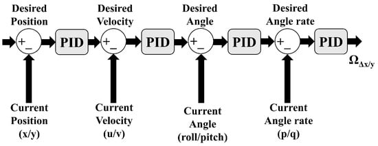 This controls the motion along the horizontal x- and y-axes through the use of four cascaded PID loops for position, velocity, angle, and angular rates, as illustrated in Figure 13. The first two layers of the controller are the position and velocity PID loops, which output the desired velocities and angles about the x(roll)- or y(pitch)-axis, respectively. These two PID controllers are followed by an angle and angular-rate PID controller, which takes the error between the desired angles/desired angular rate and the current angles/current angular rate of the vehicle as input. The angle and angular rate PID together ensure that the pitch and roll angles remain steady, without abrupt changes. The output of the angular rate PID loop, which is the final output of this controller is the difference in RPM between the motors on either side of the y-axis (left and right motors) leading to changes in the roll angle () or the difference in RPM between the motors on either side of the x-axis (front and rear motors) that leads to changes in the pitch angle ().