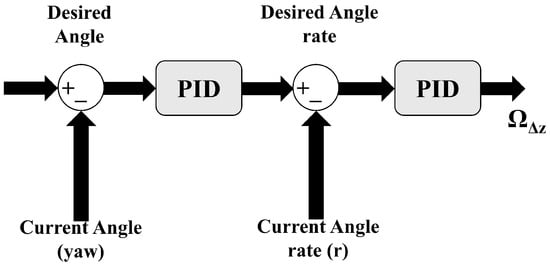 The heading controller is used to control the aircraft heading and is operated by controlling both the heading angle and the yaw rate. It does this using two cascaded PID loops, namely, an angle and an angular rate PID, to achieve the desired heading and yawing rate specified by the user, as shown in Figure 14. The angle PID takes the difference between the desired heading angle and the current heading angle as input and outputs the desired angular velocity/rate about the vertical z-axis. This angular velocity/rate is then fed into the angular rate PID, which takes the difference between the desired angular velocity and the current angular velocity as input. The final output of the heading controller is the desired difference in RPMs between the clockwise and counterclockwise rotors, denoted as (). This generates a moment that rotates the vehicle around the vertical z-axis. For example, if the desired objective is to rotate the MAV clockwise, all clockwise motors are uniformly increased by () from the nominal value, while all counterclockwise motors are uniformly decreased by the same amount. This adjustment ensures that the net thrust and net moments about the x- and y-axes remain unchanged, while producing a positive clockwise moment in the aircraft.