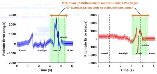 The roll and pitch of the MAV are controlled using a cascaded proportional-integral-derivative (PID) feedback controller; the control architecture is shown in Figure 4a. The gyroscope on the flight controller measures the body axis rates up to ±250 deg/s, and the pitch, roll, and yaw attitudes are calculated from the flight controller’s three-axis accelerometer, which can measure accelerations up to ±2 g; the angular rate and attitude data are then passed through a low-pass filter to obtain a more accurate estimation of the actual MAV dynamics. The pilot commands a desired pitch and roll attitude with an RC transmitter, limited to ±35° and the error between the desired attitude and the actual attitude is scaled by the proportional-only outer loop controller to the desired rate. From there, the desired rate becomes the setpoint for the inner loop. The error between the setpoint and the actual angular rate is passed to the inner-loop PID controller. The PID computations are performed at a frequency of 4 KHz. Once both loops stabilize, the controller alters the revolutions per minute (RPM) of each motor to produce the desired attitude output for the MAV.