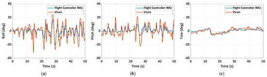 The next flight case brings an increase in complexity. The model must now start by simulating the free motion of the MAV under the influence of only gravity with the initial conditions provided during launch (free fall) until the motors are switched on. As soon as the motors are on, the objective of the flight controller is to stabilize the MAV in the shortest time possible. The pilot starts giving commands at some time instant after the stabilization, and the vehicle follows the command. The simulation model also starts with the simulation of the free fall region and then prioritizes stabilizing the MAV before executing a trajectory tracking control. The free fall phase typically lasts for less than 0.5 s depending on how fast the pilot issues stabilization commands to the MAV. Despite its brief duration, this is a crucial region and dictates the state of the MAV just before the motors start rotating. It is also important to input an accurate set of initial conditions into the simulation because at the moment the vehicle leaves the user’s hand, it could have high linear and angular velocities. Obtaining these values from flight data can be challenging and can have a huge impact on the final state of the MAV due to its low inertia. After free fall, when the pilot activates the stabilization mode, the flight controller autonomously stabilizes the vehicle regardless of any other pilot commands. This region of stabilization also only lasts for less than a second, and after that it responds to the pilot’s commands. As mentioned earlier, the simulated controller is not exactly the same as the actual flight controller on the physical MAV, but rather a conventional controller that is tuned to behave like the actual controller. Hence, most of the discrepancies in the simulation results compared to the experimental data can be attributed to inaccurate initial conditions and small differences in the flight controller. Furthermore, the motion capture data and flight controller IMU data are collected with different start times, leading to minor inconsistencies when mapping the two instances to the same timescale.