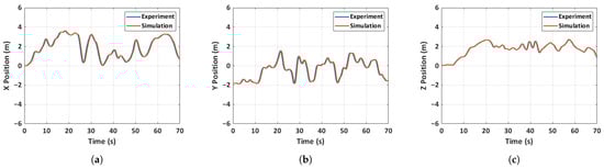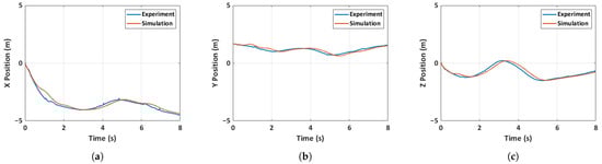 Comparison of experimental and simulated position for case 2: unfolded hand-launch. (a) X-position, (b) Y-position, (c) Z-position.