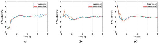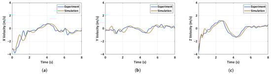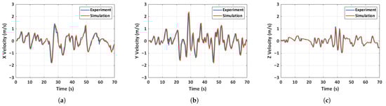 Comparison of experimental and simulated velocity for case 2: unfolded hand-launch. (a) X-velocity, (b) Y-velocity, (c) Z-velocity.