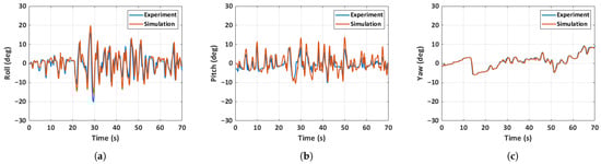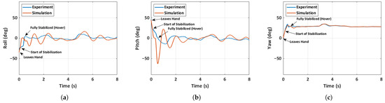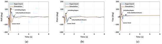 Comparison of experimental and simulated attitude for case 2: unfolded hand-launch. (a) Roll angle, (b) pitch angle, (c) yaw angle.