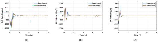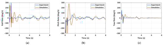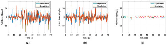 Comparison of experimental and simulated angular rates for case 2: unfolded hand-launch. (a) Roll rate, (b) pitch rate, (c) yaw rate.