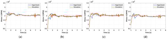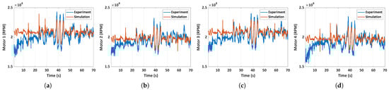 Comparison of experimental and simulated motor RPM for case 2: unfolded hand-launch. (a) Motor 1 RPM, (b) motor 2 RPM, (c) motor 3 RPM, (d) motor 4 RPM.