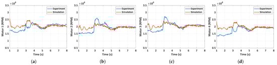 Comparison of experimental and simulated motor RPM for case 3: folded hand-launch. (a) Motor 1 RPM, (b) motor 2 RPM, (c) motor 3 RPM, (d) motor 4 RPM.