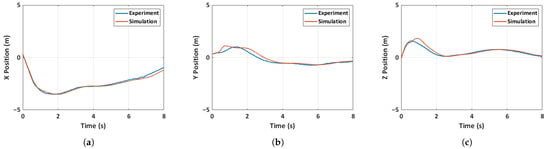 Comparison of experimental and simulated position for case 3: folded hand-launch. (a) X-position, (b) Y-position, (c) Z-position.