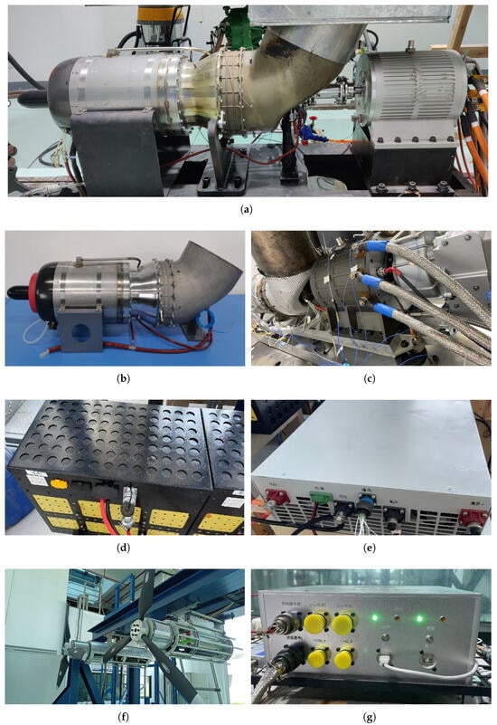 Physical images of various components in the hybrid system. (a) TSE system. (b) Turboshaft engine. (c) High-speed generator. (d) Power battery pack. (e) Bidirectional DCDC converter. (f) Propeller. (g) Coordinating controller.