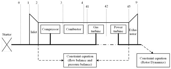When modeling, first, based on the real structure of the turboshaft engine in the test system, the model is divided into sub-components such as the intake port, compressor, combustion chamber, gas turbine, power turbine and exhaust pipe, as shown in Figure 3, and the cross-sectional positions of different components are divided. Secondly, each relatively independent component is described, respectively, with the corresponding aerothermodynamic equations. Among them, the compressor, gas turbine and power turbine play a key role in the overall performance of the turboshaft engine, especially involving complex aerothermodynamic processes, and it is particularly necessary to introduce additional characteristic diagrams for description []. However, precise component-level characteristic data is difficult to obtain and is replaced by general characteristic maps during the modeling process. Among them, Section 0: Airflow far in front of the engine; Section 1: Inlet of the air inlet; Section 2: Compressor inlet; Section 3: Compressor outlet/combustion chamber inlet; Section 4: Outlet of the combustion chamber; Section 41: Inlet of gas turbine; Section 42: Gas turbine outlet; Section 45: Power turbine outlet; Section 9: Tail nozzle outlet.
