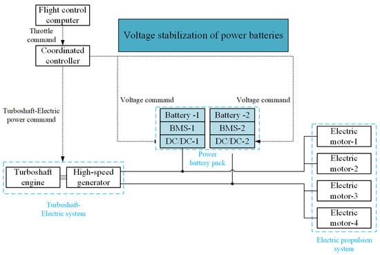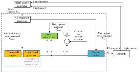 Bus voltage stability is the foundation for the stable operation of DC microgrid systems. This requires that in TSE systems and power battery systems, there must be exactly one energy system responsible for maintaining a constant DC bus voltage. Therefore, the control strategy of the integrated system should include two main forms: “ turboshaft-electric system voltage stabilization” or “power battery voltage stabilization”. Owing to the order-of-magnitude difference in time scales between the turboshaft engine’s thermodynamic system and power-electronic devices, adopting the “turboshaft-electric system voltage stabilization” strategy may prolong transition times during dynamic processes. “Power battery voltage stabilization”, on the other hand, has a faster response speed and is relatively more conducive to enhancing the dynamic stability of the system.