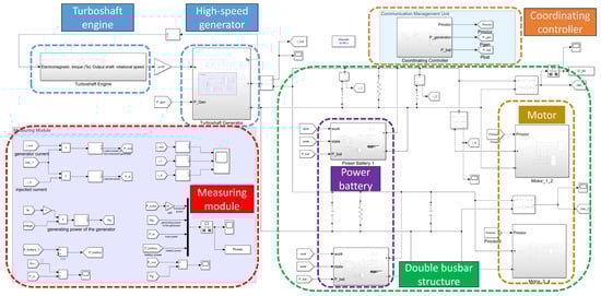 Based on the modeling and design of each main component and its controller, the system adopts the “reverse simulation method”, that is, starting from the required power of the load motor under different working conditions, the working state of the energy system is adjusted in reverse. To sum up, the integrated dynamic simulation model of the 200 kW-class series-connected aviation hybrid electric propulsion system is shown in Figure 5.