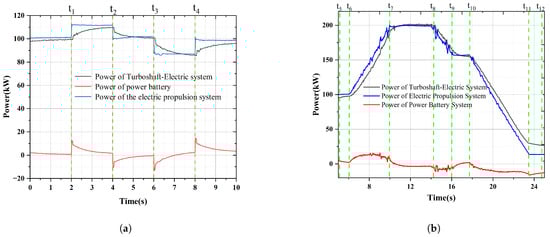When the motor operates stably with a power output of 105 kW under the predetermined cruising condition, the working status of all components of the system is normal. Suppose the power demand of the load fluctuates by approximately “+10 kW to 0 to −10 kW∼0” to simulate the state changes of the system under sudden disturbances. As shown in Figure 6a, the power battery pack can quickly track load changes with a near-instantaneous response, while the TSE system is allowed to achieve state regulation for a longer time. Among them, when = 6 s, the load demand decreases and the generation power is greater than the load power. At this time, the power battery pack absorbs the redundant electrical energy on the DC bus to charge itself, and the power performance is negative, which is in line with the expected design requirements. As shown in Figure 6b, the hybrid propulsion system switches from the cruise condition to the takeoff condition at , with the electric motor gradually ramping up to full-power output. At , it reaches the takeoff condition, i.e., the maximum-power (200 kW) output point. At , the system transitions to the climb condition, and the power decreases gradually. At , it arrives at the climb-condition power point (170 kW). At , the system switches to the idle condition and reaches the idle condition at .