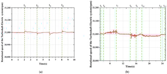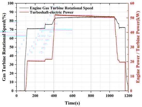 The comparison between turboshaft-electric power and the rotational speed of the gas turbine is shown in Figure 14. The gas turbine rotational speed maintains a stable plateau during the power output phase, which is critical for the hybrid power system’s operation. Such stable speed ensures continuous mechanical energy supply, enabling the power turbine, battery, and electric propulsion system to work in coordination. It also avoids efficiency losses or component wear from abrupt speed fluctuations, laying a foundation for reliable energy management and system performance.