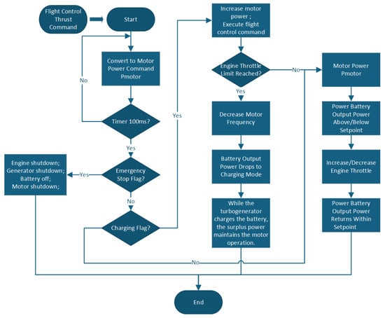 In terms of hybrid power systems, Wu Xiong et al. [] analyzed the hybrid power systems of unmanned aerial vehicles based on their architectural forms, characteristics and current development status. They refined and analyzed four key technologies: overall design technology, high-efficiency and high-power-to-weight ratio motors, comprehensive energy management, and high-energy-density energy storage. They summarized the development trends of technical research and put forward targeted suggestions. Sun Xiaokang et al. [] performed an overall design of the hybrid power system for a light general-aviation aircraft, established models of the turbine power generation system and the energy storage system, and subsequently conducted simulations of the series hybrid power system under two operating modes using these models. It was found that the designed hybrid power model reduced fuel consumption by 1.4% compared to the traditional propulsion system. Zhuang Weichao et al. [] classified 14 possible hybrid power system configurations based on binary trees and discussed the future trends of hybrid power systems. Laurencas Raslavičius et al. [] adopted the hybrid powertrain control algorithm in the design of hybrid electric vehicles, reducing fuel consumption and waste emissions.