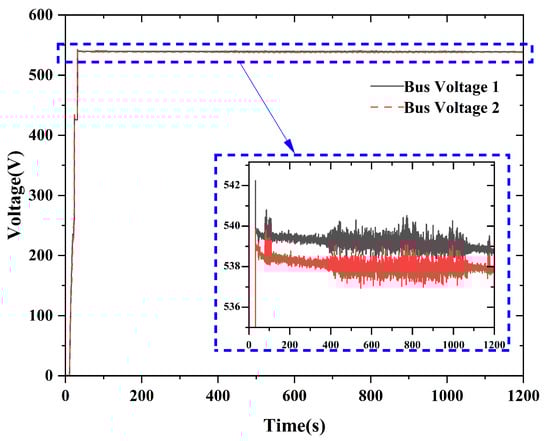 Bidirectional DC/DC converters are a key component for achieving energy conversion in the system. It can convert electrical energy between two different voltages and support the bidirectional flow of energy []. During charging, the bidirectional DC/DC adjusts the electrical energy generated by the TSE system to a voltage suitable for the battery for charging. During discharge, the energy stored in the battery is converted into the voltage required by the system through bidirectional DC/DC to power the propulsion system for use. The voltage range on the battery side of the bidirectional DC/DC is 200 to 850 V, and the maximum current on the battery side is 100 A. The maximum current on the DC bus side is also 100 A. The physical diagram of bidirectional DC/DC is shown in Figure 2e.