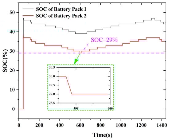 (1) As shown in Figure 15 and Figure 16, the system enters the charging protection state during operation. The SOC of the power batteries at startup is 34% and 44%, respectively. After entering the energy management operation for about 3 min, the battery power drops to 29%, and it enters the charging stage.