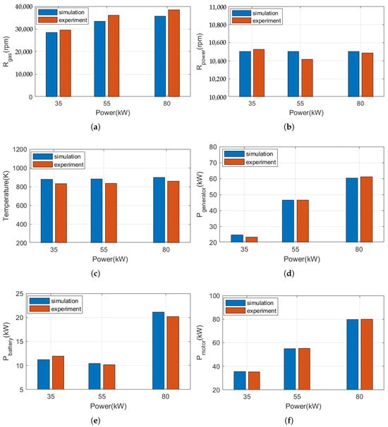 Simulation vs experimental test comparisons. (a) Gas turbine rotational speed system. (b) Power turbine rotational speed. (c) Power turbine exit temperature. (d) High-speed generator output power. (e) Battery power. (f) Electric motor output power.