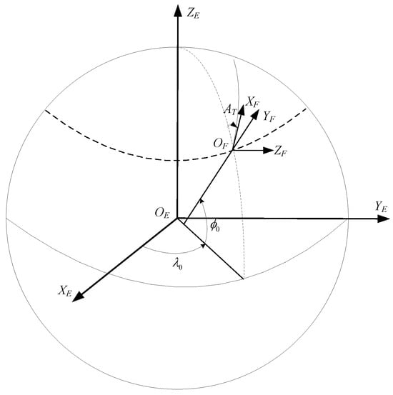 As shown in Figure 2, the coordinate system is the ECEF system and the coordinate system is the LCS. The starting point of the flight vehicle is , the axis is defined by a vertical line through the starting point, the upward direction is positive, and the axis is perpendicular to the axis and points in the direction of aiming. At the starting point, the angle between the axis and due north along the astronomical meridian is referred to as the geodetic azimuth of the starting point. The axis together with the , axis forms a right-handed right-angle coordinate system. After the longitude, latitude, and altitude of the starting point and the target point are determined, the geodetic azimuth can be calculated through inverse geodetic algorithm. Then, the position of the LCS is completely determined, and thus a standard rocket-powered trajectory curve is determined.