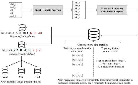 After obtaining multiple sets of initial parameters, the corresponding geographic coordinates of the starting point and the target point are computed by direct geodetic algorithm. Then, the trajectory data is calculated using a standard trajectory calculation program. As for the principles of the standard trajectory calculation program, it involves fourth-order Runge–Kutta numerical integration based on the motion model of a flight vehicle. Its solution process follows the following assumptions: (1) Under the action of the control system, the vehicle is always in an instantaneous torque equilibrium state; (2) The Euler angles involved in the computation are considered to be small quantities, meaning that their sine values are approximated by their radian values, and their cosine values are taken as 1. When products of these angle values appear, they are treated as higher-order terms and thus neglected. Upon acquiring multiple raw trajectory data, further processing is required to derive both trajectory feature data samples and trajectory scatter data samples (processed into three segments: Front, Mid, and End), where the trajectory scatter data unfolds each trajectory in a chronological sequence. The specific workflow for sample generation is illustrated in Figure 4.
