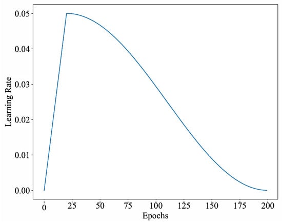 In Figure 6, the vertical axis of the graph represents the learning rate, and its maximum value is set to 0.05; the horizontal axis represents the epochs, for a total of 200. During the first 1/10th of the epochs, the learning rate increases linearly from 0 to 0.05, and after that, the cosine-decays to 0 from 0.05.