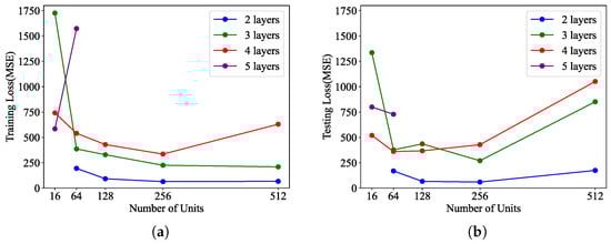 Cross-validation of the number of hidden layers and units: (a) Training errors in different network structures. (b) Testing errors in different network structures (network structures that are not labeled with loss values represent poor convergence results).