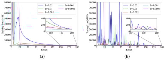 The outcomes are illustrated in Figure 8 and several conclusions can be drawn: a smaller LR can decrease fluctuations in training and validation losses, but an excessively small LR will significantly slow down the convergence speed. Therefore, to strike a balance between accuracy and computational load, a learning rate of 0.001 is selected for subsequent experiments.