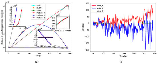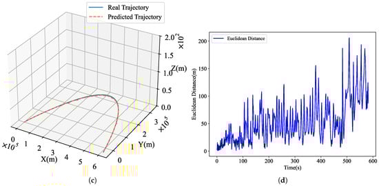 Figure 9c displays a comparison of the complete flight trajectory in the LCS, while Figure 9d illustrates the Euclidean distance between the actual and predicted positions at each moment, representing the prediction error in three-dimensional space. Observing Figure 9d, it is evident that the Euclidean distance slightly increases over flight time, similarly to the marginal increase in errors in the x and the y directions depicted in Figure 9b. Overall, the majority of instances correspond to Euclidean distances below 100, with distances ranging between 100 and 200 in the later stages of flight. Such predictive accuracy is viable for providing trajectory simulation verification for the process of MPDM for multi rocket-powered vehicles.