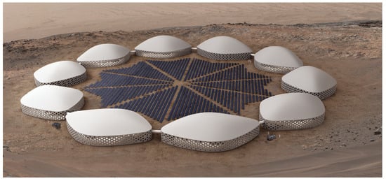 Several studies have suggested subsurface habitats to reduce radiation exposure and provide better thermal insulation in more stable underground temperatures []. Rather than burying the habitat underground [], with the goal of providing the crew with natural lighting and psychological well-being, propose an above-surface habitat design that plans to reach acceptable standards with passive and active shielding against radiation and further countermeasures to ensure crew safety in both short and long-term missions.