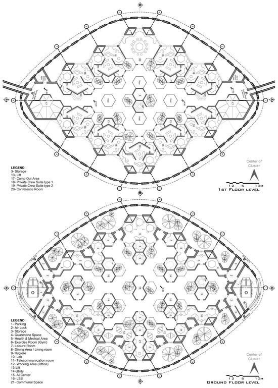 Each MHU is equipped with medical rooms, labs, office-type work areas, telecommunication, and AI centers, as well as systems rooms where the components of the Life Support System (LSS) are located on the ground floor. And on the first floor, there are private suites for crew members, emergency escape routes to the neighboring MHUs, and access to the second floor, which includes only the central regions of the plan and is solely designated for emergency cases as a bunker (Figure 2).
